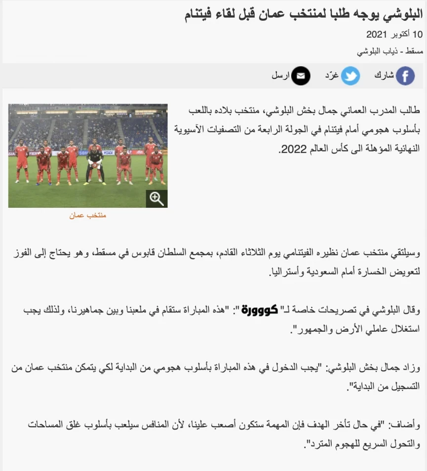 Mới đây, tờ Kooora đã có bài đăng tải phỏng vấn cựu danh thủ đồng thời cũng là một HLV người Oman – Al-Balushi với tựa đề: “Al-Balushi gửi lời yêu cầu tới ĐT Oman trước trận gặp Việt Nam”. Trong bài phỏng vấn, cựu danh thủ này cho biết: “Trận đấu này sẽ được tổ chức trên sân nhà vì vậy đội bóng cần phải nhập cuộc với lối chơi tấn công ngay từ đầu để có thể ghi bàn sớm nhất có thể.