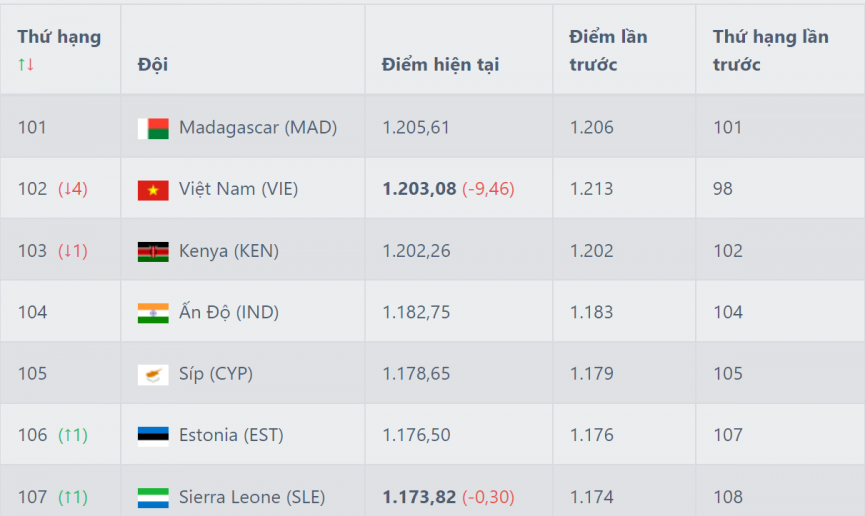 Theo tính toán của trang Football Ranking, ĐT Việt Nam bị trừ 6,45 điểm sau trận thua Australia và rơi xuống hạng 102 thế giới.