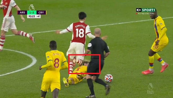 Nhưng sau đó, Tomiyasu lại dùng đầu gối đá vào đầu Gallagher khiến cầu thủ bên phía Crystal Palace nằm đau đớn. Trọng tài Mike Dean quyết định chỉ cho Crystal Palace hưởng quả phạt nhưng lại không rút thẻ đối với hậu vệ người Nhật Bản. Nếu đó là một tấm thẻ đỏ thì trận đấu có thể sẽ an bài bởi chỉ ít phút sau đó, Arsenal đã có bàn gỡ vào những giây cuối cùng nhờ công của Lacazette.